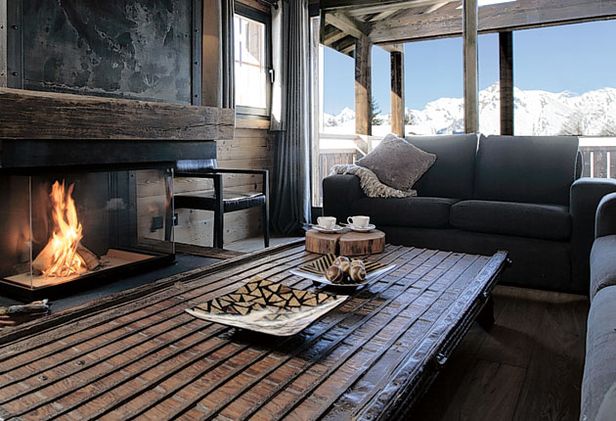 Ключевой материал в интерьере шале – это, конечно, древесина, необработанная, дорогая и естественного происхождения. Для пола выбирают цельное дерево, покрывают его либо лаком, либо воском, или специальным покрытием. Обязательным элементом потолка являются деревянные балки. Это – визитная карточка стиля шале. Одна из стен также может быть декорирована древесиной или же полностью состоять из нее, так складывается ощущение дома в лесу, даже если интерьер в стиле шале выполнен в городской квартире.