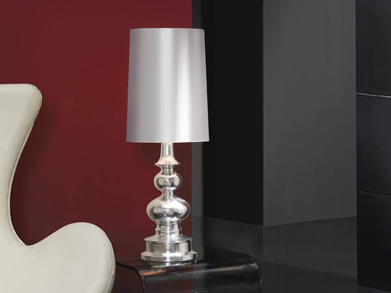 Из синтетической смолы, с покрытием из серебряной фольги, абажур из серебристой ткани.